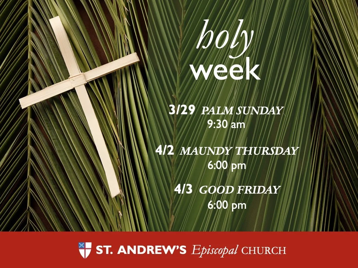 All are welcome to join the people of St. Andrew’s Episcopal Church for the most sacred liturgical week of the church’s calendar. Our liturgical life during Holy Week connect us with the sacred stories of our faith and recalls the entry of Christ into Jerusalem, Jesus’s crucifixion and ultimate triumph over death. You are invited to journey with us as we head toward the cross and the coming joy of Easter!